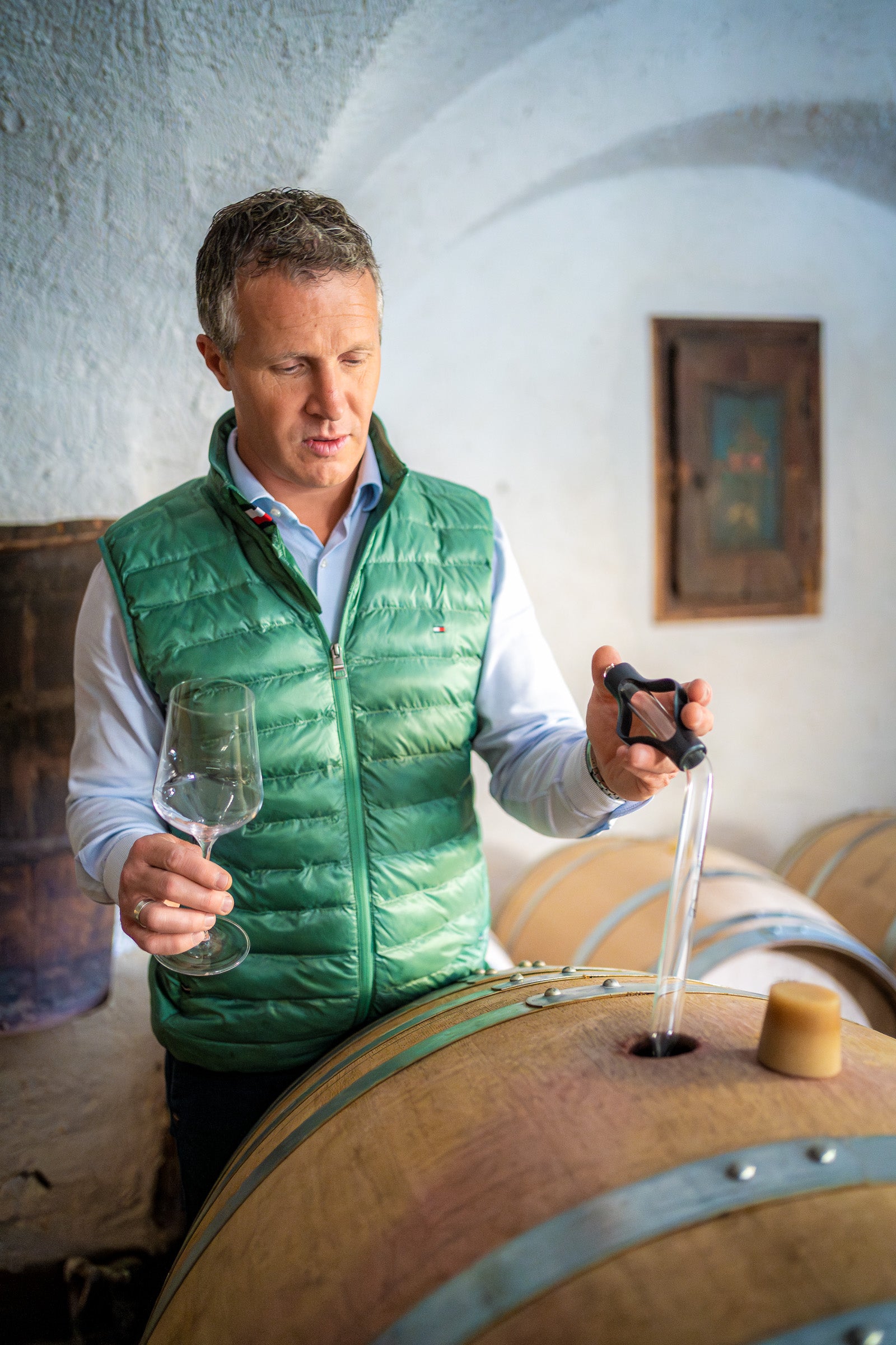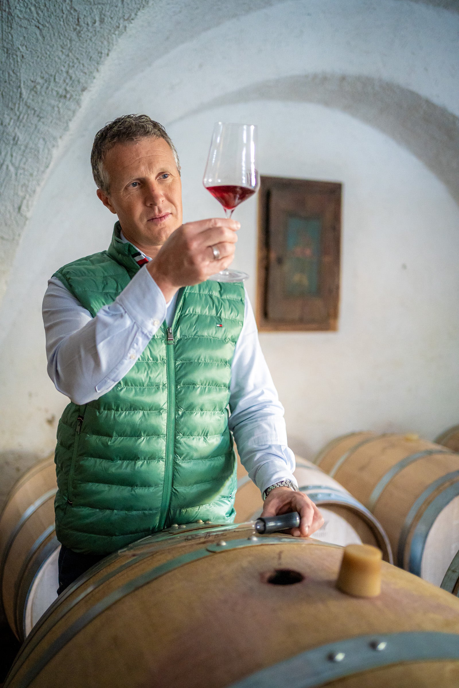 Das Weingut Castel Sallegg liegt in Kaltern an der Weinstraße, einer der renommiertesten Weinregionen Südtirols. Die Geschichte des Weinguts reicht bis ins 16. Jahrhundert zurück, als es von den Herren von Sall erbaut wurde. Im Jahr 1851 übernahm Erzherzog Rainer, Vizekönig v. Lombardo-Venetien (1783-1853) das Anwesen, bevor es in den Besitz der Grafen von Kuenburg überging, die es bis heute mit großer Hingabe führen. Die Weinberge von Castel Sallegg erstrecken sich über 30 Hektar und verteilen sich auf drei historische Höfe: Preyhof, Leisenhof und Seehof. Die Rebflächen befinden sich auf Höhenlagen zwischen 230 und 550 Metern, was eine optimale Vielfalt an Mikroklimata für verschiedene Rebsorten bietet. Auf den sandig-lehmigen und kalkhaltigen Böden gedeihen sowohl klassische als auch autochthone Rebsorten, darunter Weißburgunder, Blauburgunder, Merlot, Lagrein, Cabernet Sauvignon und Rosenmuskateller. Der über 1000 Jahre alte Weinkeller kombiniert traditionelle Methoden mit modernster Kellertechnik, um Weine von höchster Qualität zu produzieren. Mit einer Jahresproduktion von rund 200.000 Flaschen setzt das Weingut auf höchste Qualität und Nachhaltigkeit. Bemerkenswert ist, dass Castel Sallegg als erstes Weingut in Südtirol seine Weine in Leichtglasflaschen aus 100 % Recyclingglas abfüllt, ein bedeutender Schritt für umweltfreundlichen Weinbau. Die Weinphilosophie basiert auf Tradition, Nachhaltigkeit und Innovation, wobei jeder Wein die Besonderheiten des Terroirs widerspiegeln soll.
